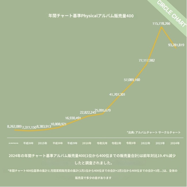2015年以降、ずっと右肩上がりの売り上げを記録していたCD販売数が10年ぶりに前年を下回る結果となっている。前年比だと19.5%のマイナス成長となってしまった。ただ下回ったと言っても2023年の1億枚超えが異質なだけだと考えることも出来る。現に、2024年も9300万枚以上は売り上げており、2022年の7700万枚と比べても1500万枚以上上回っているのだ。