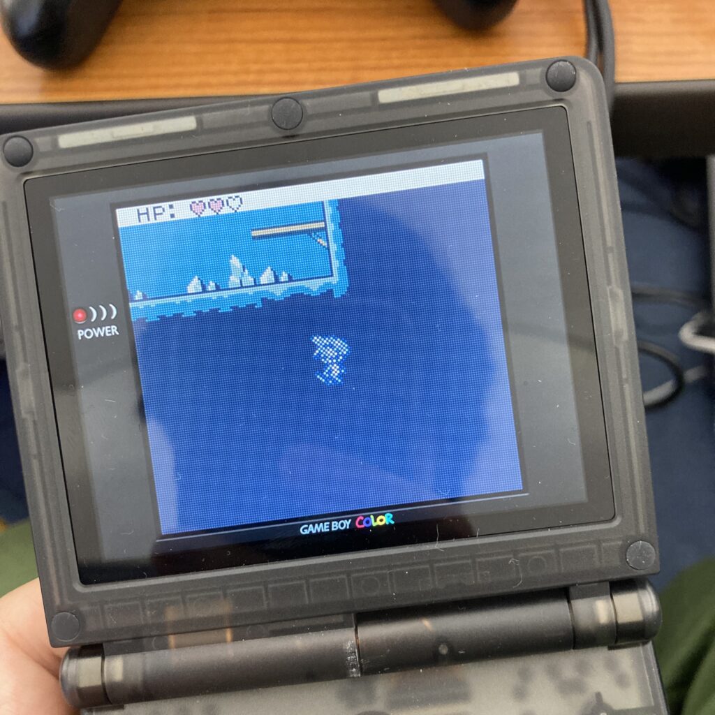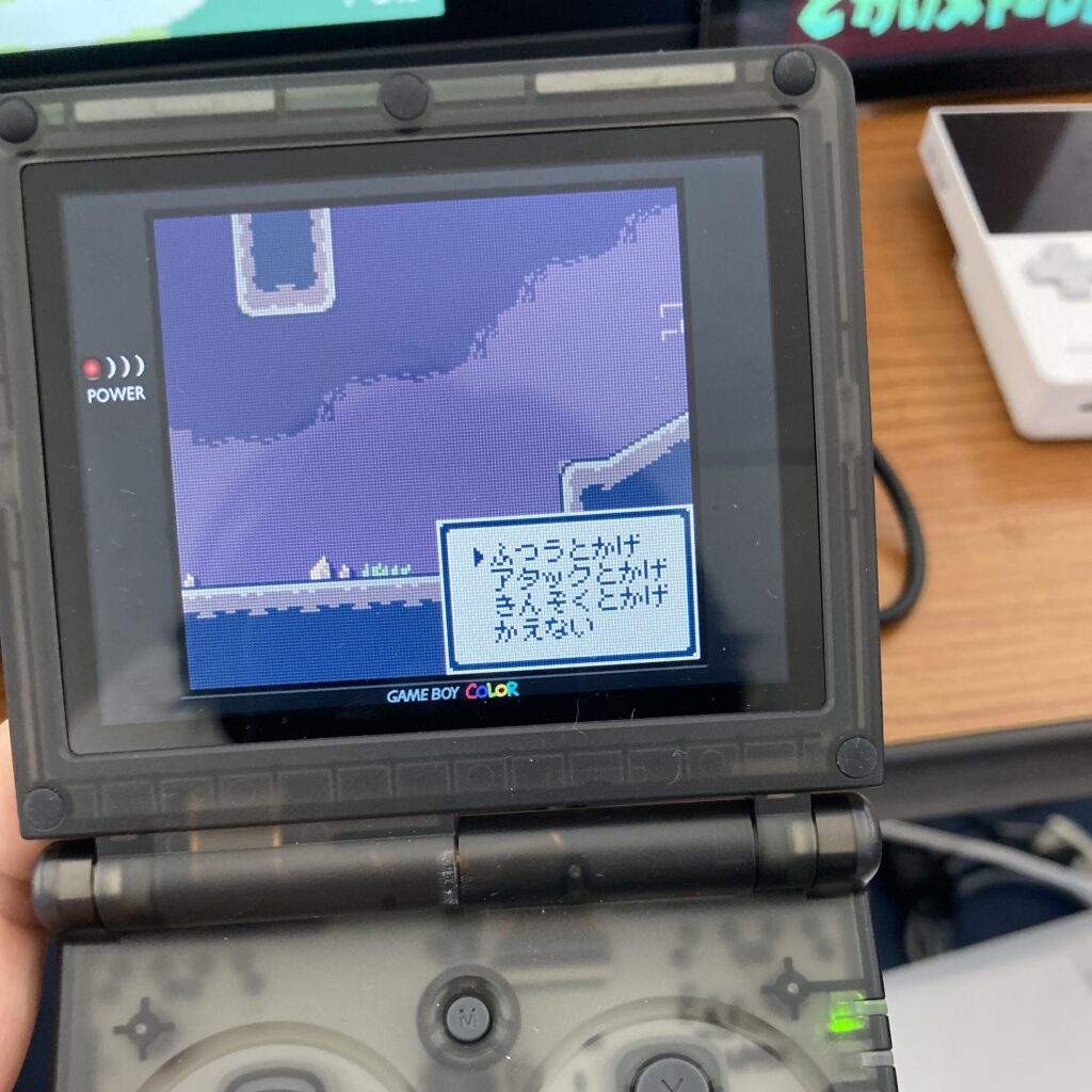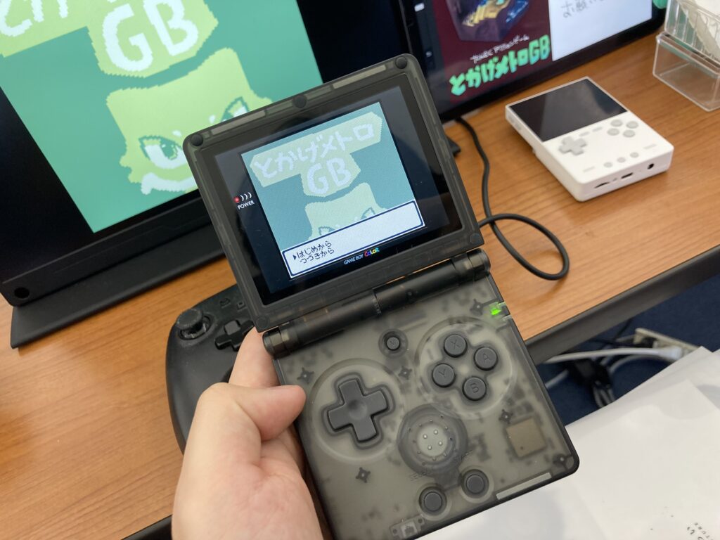 最初に紹介するのは『とかげメトロGB』です。メトロイドヴァニア形式の2D探索アクションゲームで、特筆すべきは携帯ハードで動作するという点。現場ではこの小さなデバイスを手に取り、懐かしさと新鮮さが入り混じる不思議な感覚とともにプレイしました。