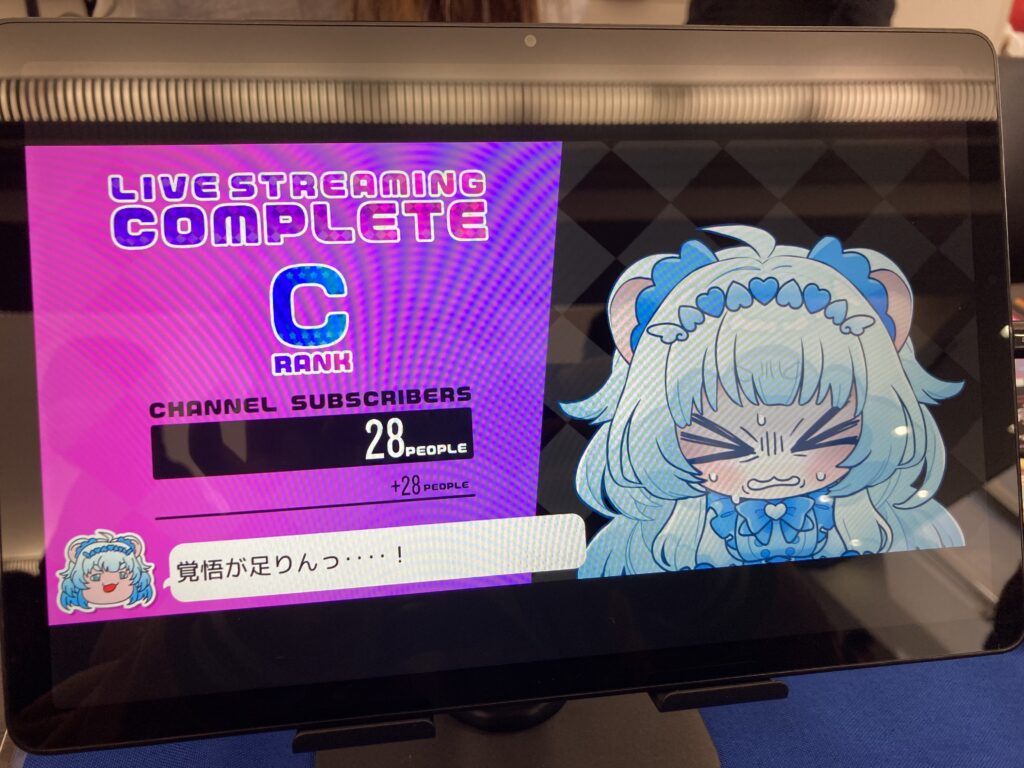 イージー、ノーマル、ハードに分かれた難易度の中で無難にノーマルを選んだものの、なかなかついていくのが難しい。おそらく、会場という環境で曲をしっかり聴けず、動体視力だけでノーツを追いかけなければならなかったことが原因かと。また、慣れないスワイプ・タップ・ホールドという操作方法が相まって、そのような困難に直面したと思いつつですが…結果的に成績はCランク。わずか28人のチャンネル登録者しか獲得できないまま終了してしまいました。残念な結果でしたが、次のプレイヤーが待っていたため、そこで席を離れざる得ませんでしたね。