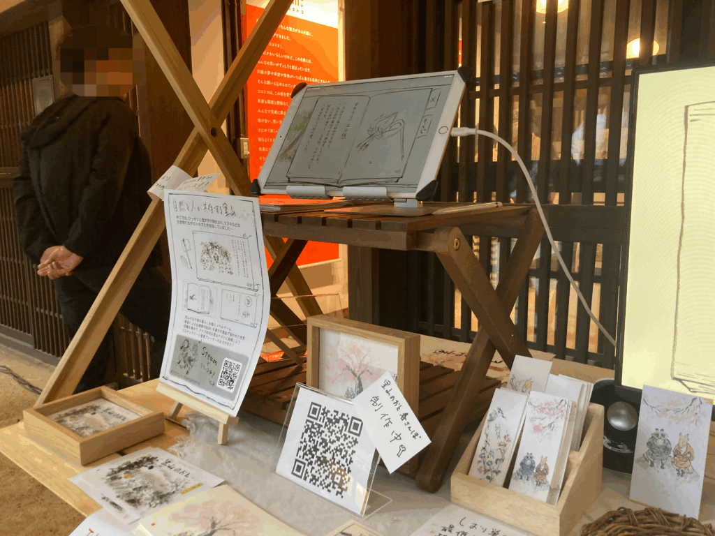 そのポストカード同様、関連グッズも繊細で魅力的でした。特にブースで配布されていた栞のデザインはどれも秀逸で、思わず全種類を手に取ってしまったほど。ちなみにこの栞、投げ銭50円から、と案内がありましたが、とてもそんな価値ではいただけないと思い、勝手ながら一枚50円計算で4種類分、200円をお支払いさせていただきました。…と、ここまでは良かったのですが、なんとその際にお財布をブースに置き忘れるという大失態をやらかしちゃいました。もし、私の顔を制作者さんが覚えていなかったら、あの土砂降りの雨の中、東京から再び川越まで財布を取りに戻るという悲劇に見舞われるところでしたね。その節は本当にありがとうございました…