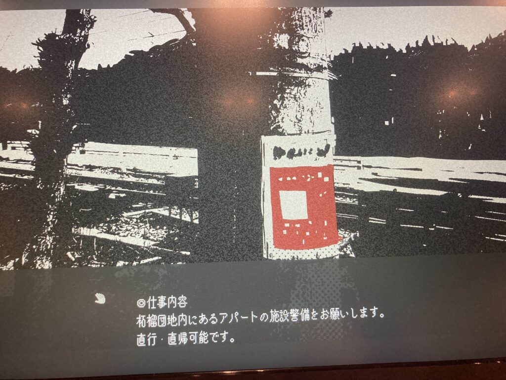 次にご紹介するのは、きじなごさんが制作された一人称視点のホラーアドベンチャー『柘榴団地』です。街のどこかに掲げられている「団地アパートの日勤警備員求人募集中」という一枚の貼り紙と、それに付随するいくつかの奇妙な「ルール」。これだけで、もうお分かりですかね?はい、いわゆる「ナポリタン怪談」のテイストを色濃く感じさせる作品でした。