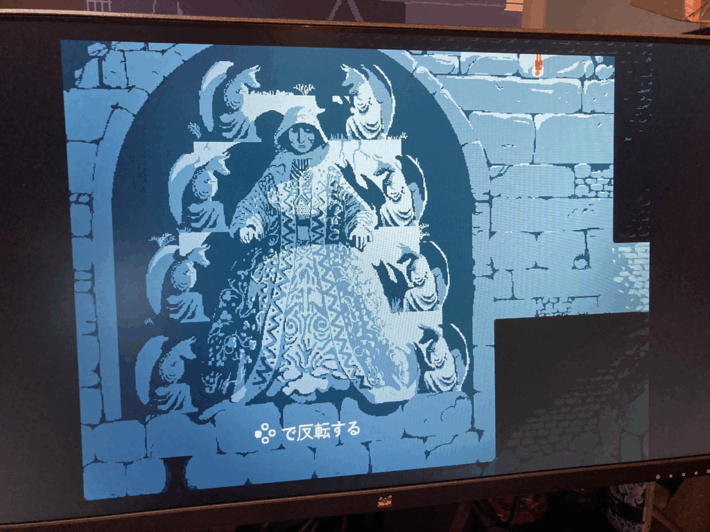 まず、ゲームシステムは極めてシンプル。ボタン一つで「重力」を反転させ、主人公は床と天井を自在に行き来できます。ただそれだけ。しかし、そのシンプルなルールとはあまりにも対照的に、背景のアートは、もはや「執拗」とすら覚えるほど、恐ろしく細密に描き込まれていたのです。一般的な16:9の比率ではない、どこか窮屈な5:4の画面の中に、緻密なドット絵で描かれた異世界の風景がぎっしりと詰め込まれている。その圧倒的な情報量が、プレイヤーに言いようのない没入感と同時に、息苦しささえ感じさせてしまうほどでした。