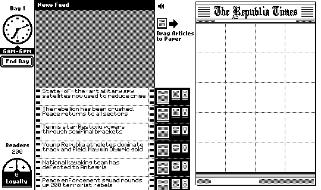 ヒヅメ:このゲームを思いついたインスピレーションは何だったかっていうところで言うと、私が思いついたわけではなくて、世の中に『The Republia Times(ザ リパブリアタイムス)』っていうゲーム、フリーゲームが既に存在してまして。『Papers, Please(ペーパーズプリーズ)』のルーカス・ポープさんが作っているゲームで、主人公が新聞記者なんです。紙面にどんなニュースを扱うか、どれくらいの大きさで扱うかっていうことで世の中が変化していくっていうのを楽しむことができるゲームです。そこを初めてプレイした時にものすごい衝撃を受けまして。すごく面白いゲームなんですけれども、時代が1950 ,60年とかそれぐらいなのかなっていう舞台設定で、かつ場所が多分…東ヨーロッパとかそこら辺の小さい軍事国家か何かなのかなっていうところだったんですね。日本人にとっては地理的にも歴史的にもちょっと遠いところでして、すごくそれでも面白いゲームなんですけど。もっとこのゲームをバッチバチと肌に感じるためには、もっともっと身近な舞台であった方が楽しいだろうなと思った時に、そういうゲームが他にはなかったので、作ってみたら面白いだろうなって思ったのがきっかけでしたかね。