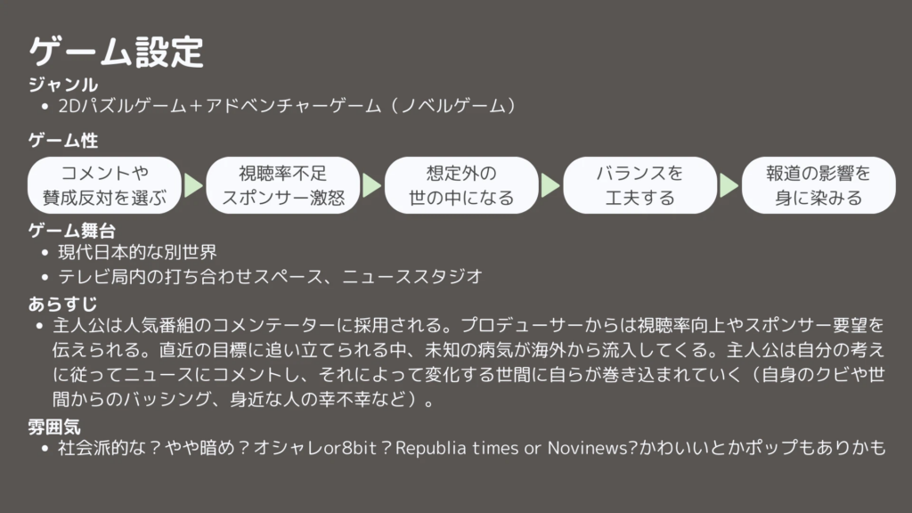 ヒヅメ:一番最初にコンセプト、このゲームがどういったところかっていうところからお話しすると、まずプレイヤーである主人公が、ゲームの世界でコメンテーターになって、ニュース番組に登場して、ニュースに対してコメントをしていくというゲームです。それに打ち合わせの際にどういうニュースに対してどういうコメントをするかっていうところをパズルのように選択をして、それによって本番の生放送で自分の発言が変わる。その発言によって視聴者の注目度であったり、スポンサーの満足度であったり、そういったものが変化しまして、そのスコアによって世の中が変わっていくっていうのを体験できるゲームです。