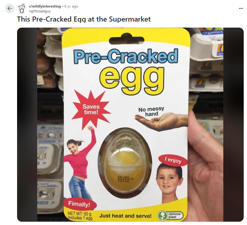 これは恐らく元ネタを知っていないと、一見意味不明なものに見えるかもしれません。これは海外で一時期話題になった「Pre-Cracked egg」というミームからきたことをここであらかじめ紹介しておきましょう。日本語で訳すと「事前に皮をむいたたまご」という意味になります。