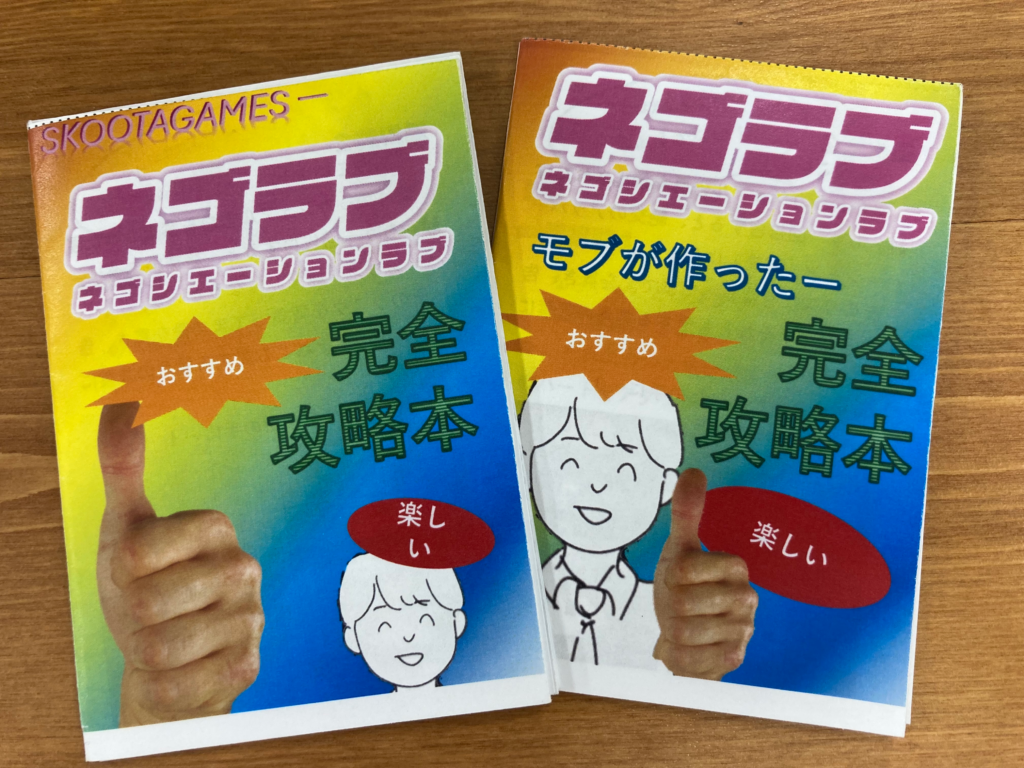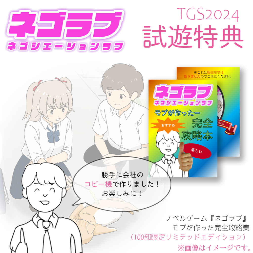 これは『ネゴラブ』という、弊社で制作中のインディゲームのタイトルですが、今回試遊をしていただいた方々に渡す「コピー本」を作っておりました。何気なくシュールな感じを出しかったのでレインボーの画像とともに100部を用意しておりました…が、結局5枚しか配れず東京ゲームショウは終了。