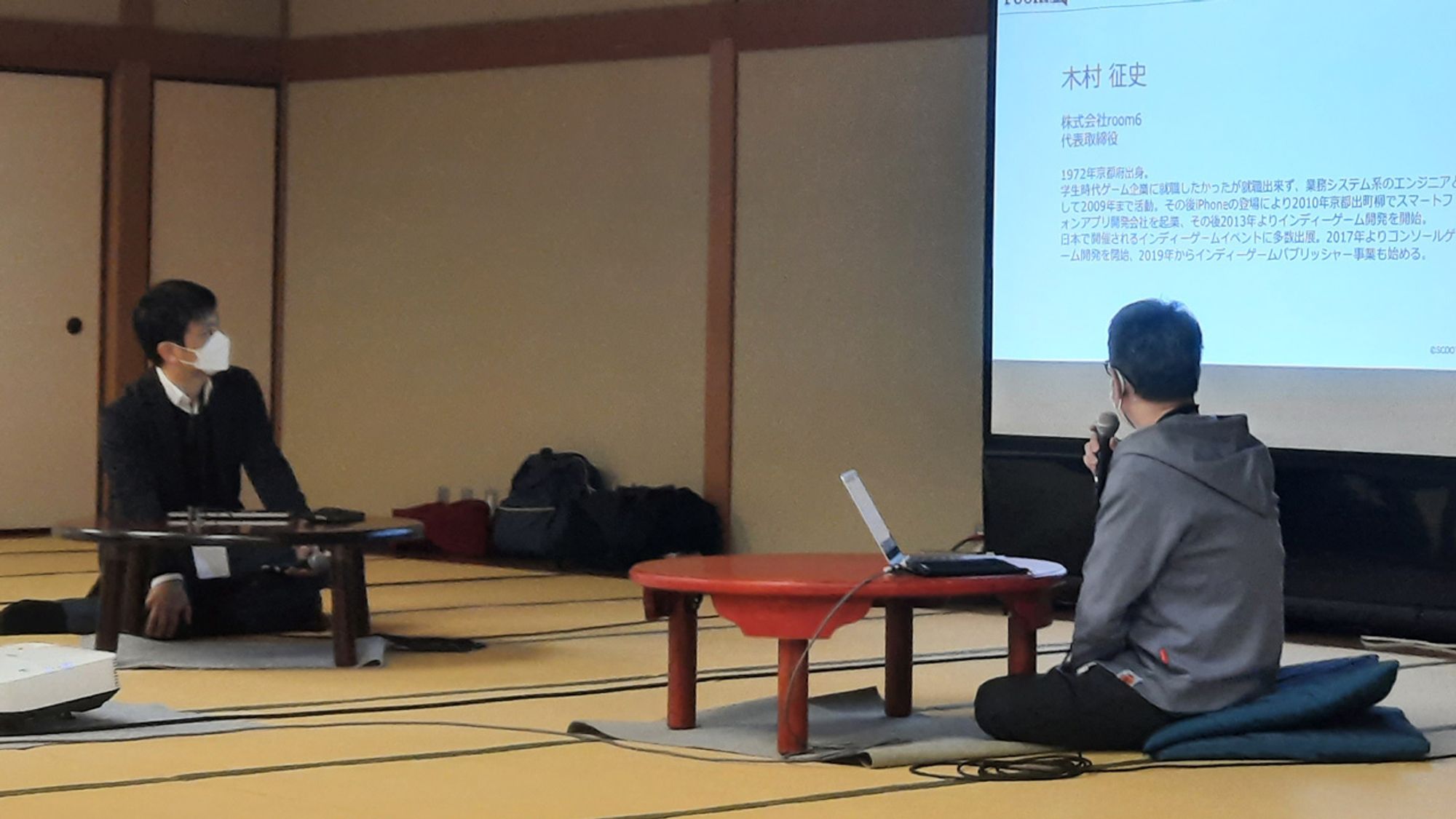 私の方が木村と申します。株式会社room6の代表をしております。1972年生まれ、京都出身、地元の出でございます。学生時代はゲーム会社に就職したかったんですが、そのときはかなわず、そこから全くゲーム以外の業界ですね、業務システムの、金融系とかそういう全然関係無い方のエンジニアとして、2009年まで仕事してたんですけど、その後、iPhoneが登場したのをきっかけに、iPhoneのアプリを作る会社を、(京都の)出町柳で起業しました。で、その後、2013年ごろよりモバイルゲームですね、モバイルのインディーゲーム開発を開始して、それから10年ぐらいゲーム開発をやってます。その傍ら、日本で開催されるインディーゲームイベントですとかに多数出展させていただいたりとか、2017年より任天堂Switch向けのコンソールゲームの開発を手がけたりしてきました。インディーゲームの方は、販売事業であるパブリッシャーも始めております。