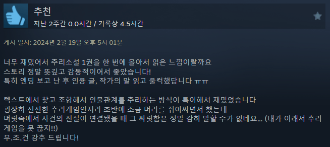 今年1月、韓国の一人開発者SOMIが公開した新作『未解決事件は終わらせないといけないから』は、最近Steamで5000件を超える圧倒的な好評レビューを記録し、大きな話題を呼んでいる。ゲームのシステム、サウンド、ストーリーがいずれも高い評価を受ける中、多くのレビューには「感動的」「共感した」「癒された」といった表現が共通して見られた。